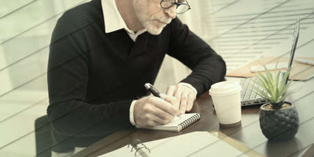 Portrait of senior man with gray hair writing in notebook while sitting at table with laptop.