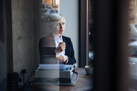 Stylish pretty blonde girl waiting for someone in a modern cafe,street reflection in window