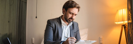 Mid aged bearded man in formal wear sitting on bed with laptop computer in the hotel room taking notes