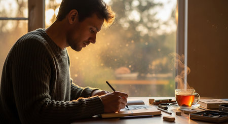 Handsome young man writing in notebook at home. Man with cup of tea.