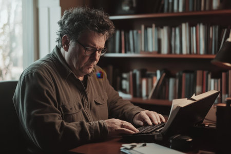 A man concentrates on typing at a laptop in a warm study, surrounded by shelves of books and natural light.