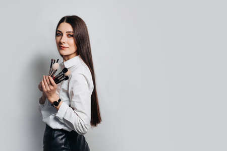 Woman who apply eyeshadow. Compose. Compose. Eyeshadow. Brush for eyeshadow. Makeup close-up space for text