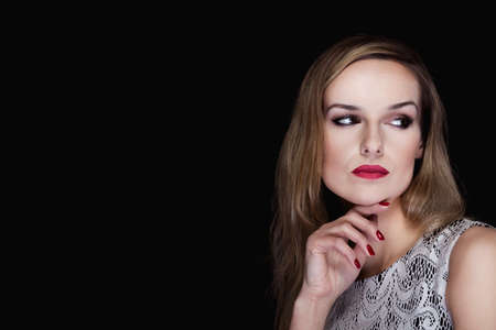 Elegant portrait of a good-looking woman in strong makeup on the black background