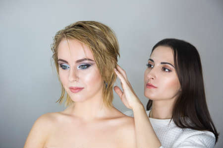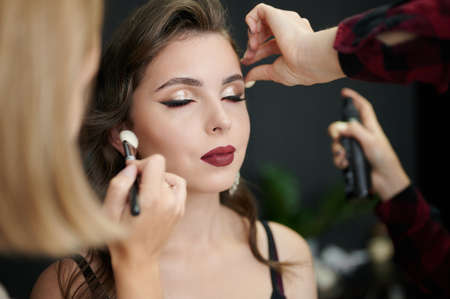 Backstage scene: Professional Make-up artist doing glamour model makeup at work
