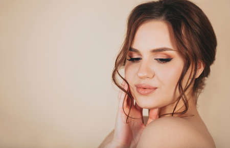 Portrait of young beautiful girl in Studio, with professional makeup. Beauty shooting. Beauty portrait of a beautiful girl with clean skin. Natural makeup, Nude