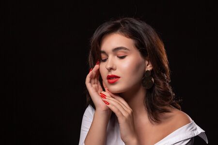 Beautiful woman with bright makeup posing isolated over black background. Image of young beautiful woman with red lips in a white shirt