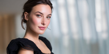 A young woman with dark hair pulled back, wearing a black dress, is looking towards the camera with a soft expression. Her makeup is natural, with a focus on her eyes and lips. The background is blurred, suggesting an indoor setting with soft lighting.