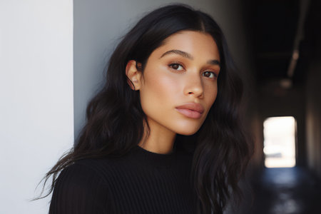 A close-up portrait of a woman with long, dark, wavy hair and striking green eyes, wearing a black turtleneck. Her lips are slightly parted, and she gazes directly at the camera with an intense expression. The lighting highlights her features, creating a dramatic and alluring effect.