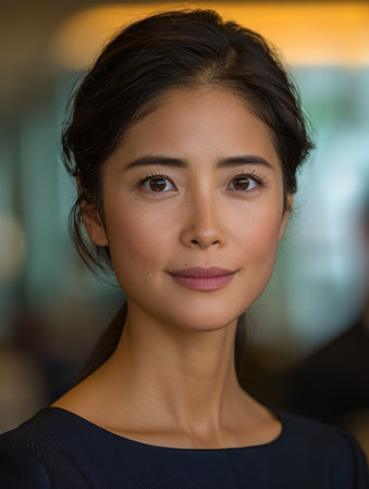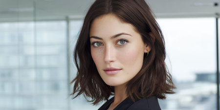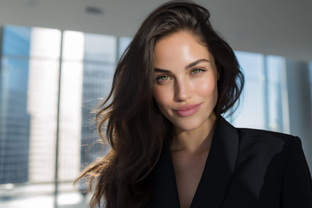 A young woman with long, dark, wavy hair and striking green eyes smiles gently at the camera. She is wearing a black blazer, and the background suggests an office or modern building with large windows, hinting at a professional setting. The lighting is soft and natural, highlighting her features and creating a warm, inviting portrait.