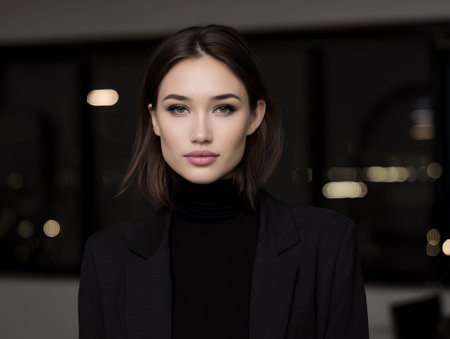 A young woman with dark hair and green eyes, wearing a black turtleneck and blazer, poses for a portrait in front of a blurred background of city lights at night.