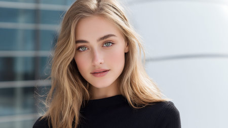 A young woman with blonde hair and blue eyes, wearing a black turtleneck, looks directly at the camera with a neutral expression.