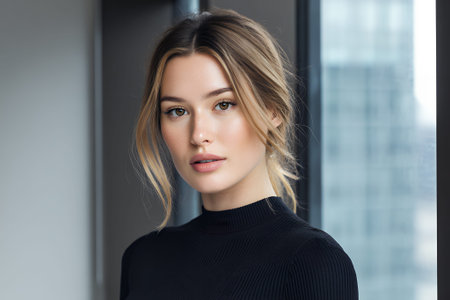 A young woman with blonde hair pulled back in a ponytail, wearing a black turtleneck, poses for a portrait in front of a blurred window with a cityscape visible.