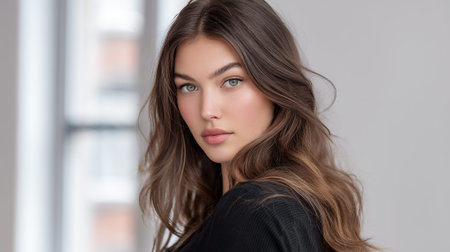A young woman with long, wavy brown hair and striking green eyes looks directly at the camera. She is wearing a black top and is positioned against a softly blurred background, suggesting a studio portrait or a candid moment captured indoors.