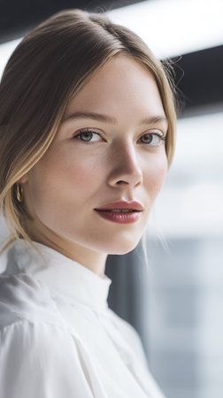 A young woman with long, wavy brown hair and striking green eyes looks directly at the camera. She is wearing a white collared shirt, and her makeup is subtle, emphasizing her natural beauty. The background is blurred, featuring abstract shapes in shades of blue and white, possibly indicating an architectural setting or a modern interior. The lighting is soft, highlighting her features and creating a gentle glow.