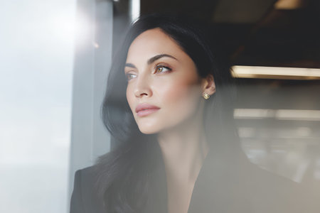 A woman in a black blazer looks out a window, her gaze thoughtful and distant.
