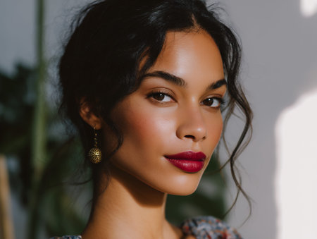 A close-up portrait of a young woman with dark hair and dark eyes, wearing bold red lipstick and a gold earring, is captured in soft, natural light. The background is blurred, with hints of greenery and a white wall, suggesting an indoor setting with a window providing light.