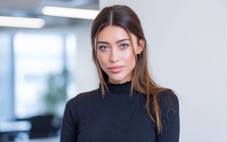A young woman with long brown hair and blue eyes, wearing a black turtleneck, poses for a portrait in an office setting.