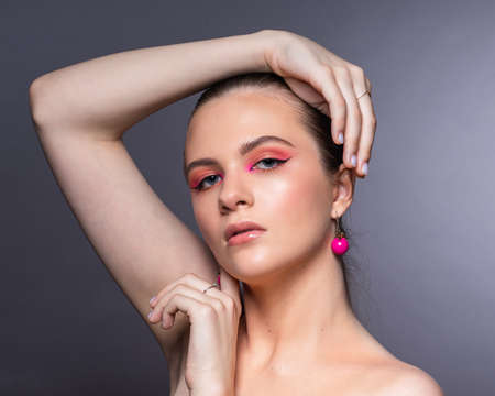 High beauty photo of a lovely young girl with wonderful professional makeup, round pink earrings, with long brown hair. Posing over gray background. Close-up. Studio shot. Portrait