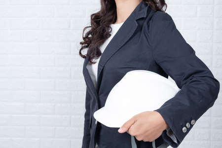 Woman of engineering holding a hat, Separate the white brick wall made gestures with sign language.