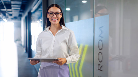 Attractive engineer woman with smile is standing in meeting room.