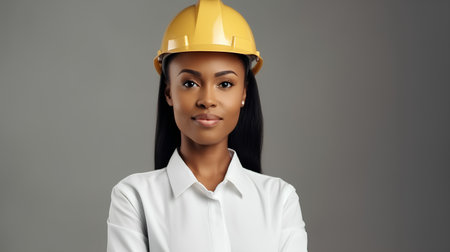 Young african american woman engineer in hardhat on gray background