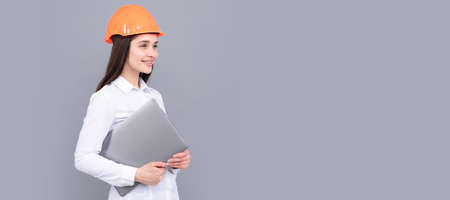 Young woman construction manager. Woman builder isolated portrait with protect helmet and laptop computer. Woman isolated face portrait, banner with mock up copy space.
