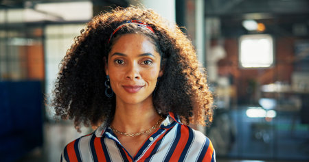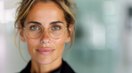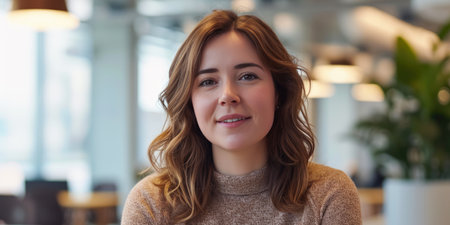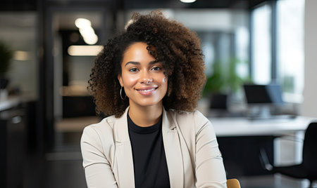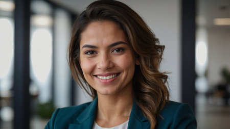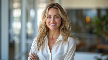 Confident businesswoman smiling warmly in a modern office environment during a bright day