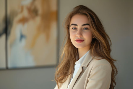 Professional businesswoman exudes confidence and competence in a modern office environment, framed certificates subtly showcasing her achievements and adding to the professional atmosphere