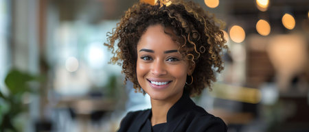 Smiling woman with curly hair in a modern office setting