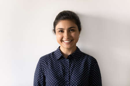 Profile picture of smiling Indian female isolated on grey studio background show optimism and positivity. Headshot portrait of happy young mixed race ethnicity woman renter or tenant feel excited.
