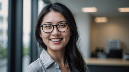 Portrait of Asian businesswoman smiling and looking at camera in office