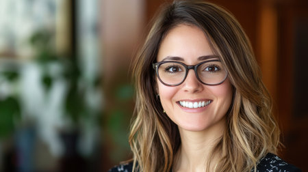 A woman wearing glasses and a white shirt is smiling for the camera. Concept of confidence and positivity