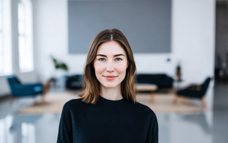 A woman poses in a bright room filled with natural light. She stands confidently, smiling with a friendly expression. The room has simple furniture and plants, creating an inviting space.