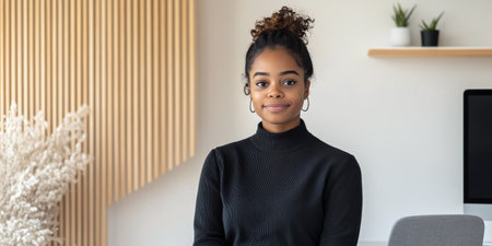 A Black businesswoman, dressed professionally, standing in a stylish corporate office, looking directly at the camera with confidence. The office features contemporary design elements and large windows that showcase the city skyline.