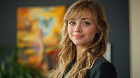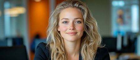 A poised blonde woman with flowing waves exudes leadership in a modern office environment, dressed professionally, with a bright, empowering atmosphere