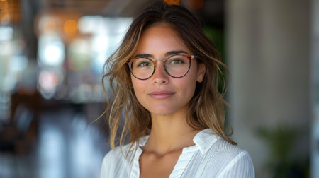 A confident woman with long, dark hair is wearing glasses and a white shirt. She is looking directly at the camera with a serious expression. The background is a blurred office setting with windows and office furniture. The woman is confident and professional, and she appears to be ready for a challenging task or a new opportunity.