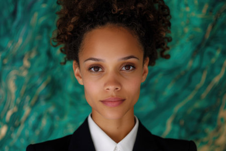 Young woman exudes confidence and natural beauty against a green backdrop.
