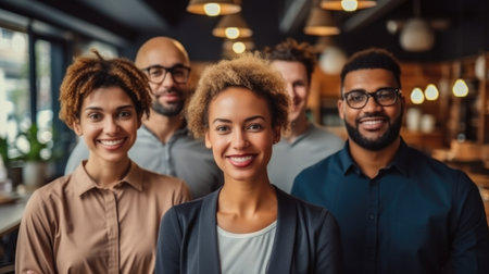 A diverse business team smiles confidently in a welllit office. Professionals show teamwork, success, and collaboration. Confident and approachable.