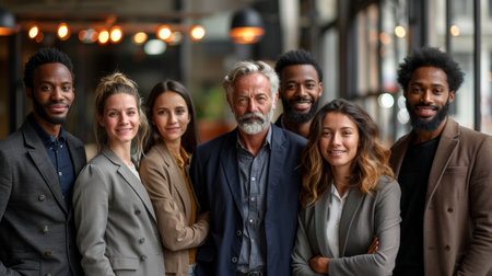 Diverse team of successful business professionals, confidently posing in a contemporary office environment, showcasing teamwork and leadership.