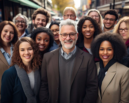 Team of multiracial business people with different ages and ethnicities standing in the city center during meeting work
