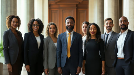 Group of diverse business professionals posing confidently in formal attire, standing in a row.