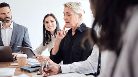 Business team having a meeting in the conference room, Senior female executive manager training her millennial staff in the meeting room.