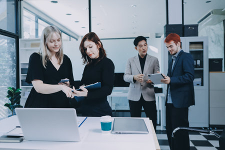 Multiracial business people working on laptop and tablet in modern office