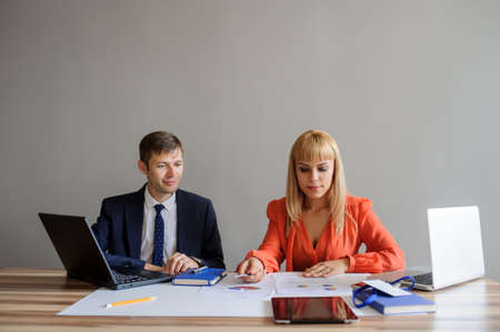 A business woman and man at a wooden office desk working at the project on the paper and computer, grey background