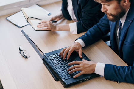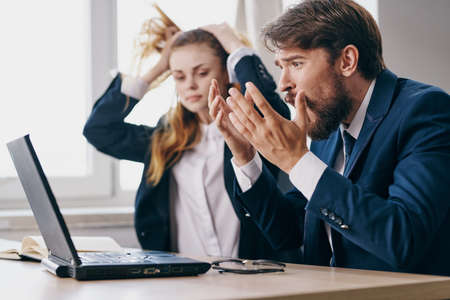 business man and woman sitting in front of a laptop teamwork internet professionals