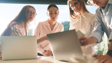 Team of people work together on company statistics in office.