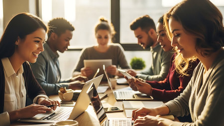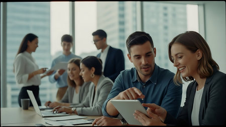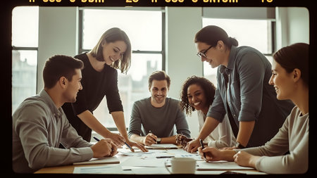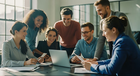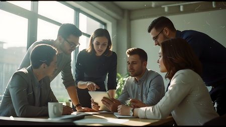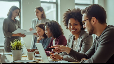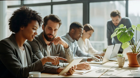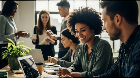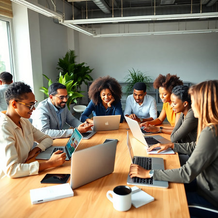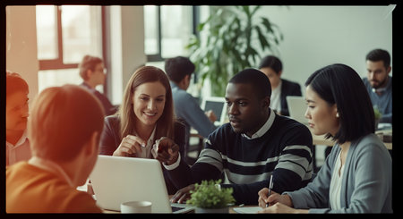 A group of diverse business professionals working together in a modern office