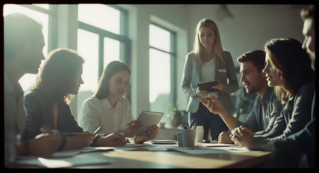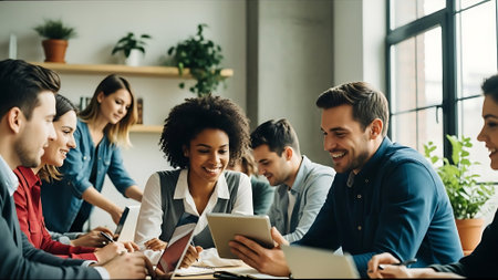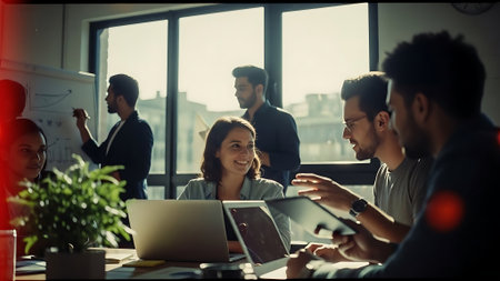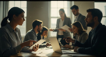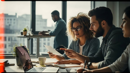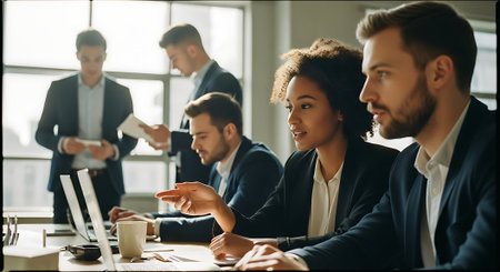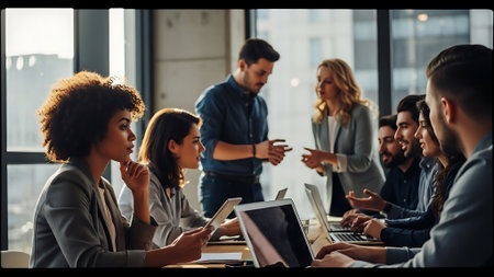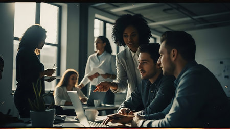 Diverse business people gather in a modern meeting room to discuss and brainstorm business ideas