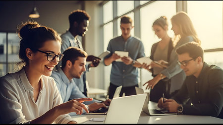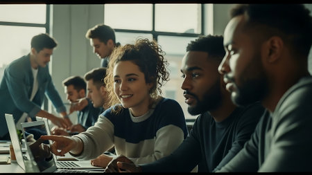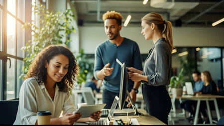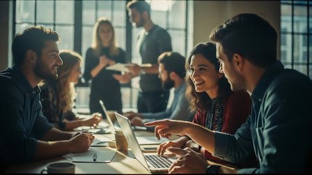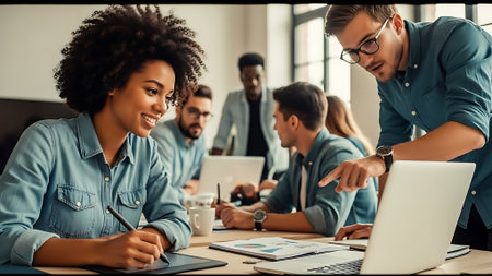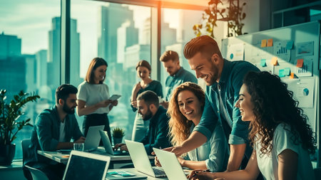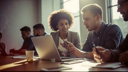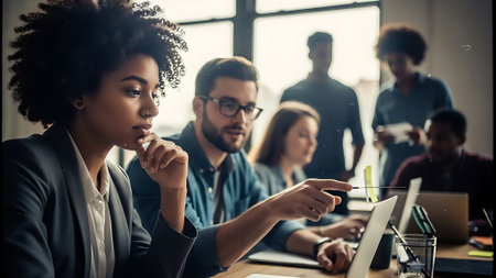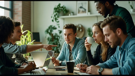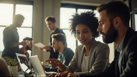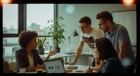 Young entrepreneurs collaborating on a business idea in a modern office environment with laptops