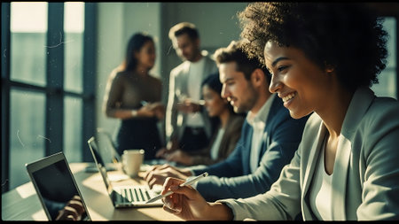 A group of diverse business professionals, dressed in formal attire, engaged in a meeting or discussion at a desk with laptops, with others standing in the background in a well-lit office setting.